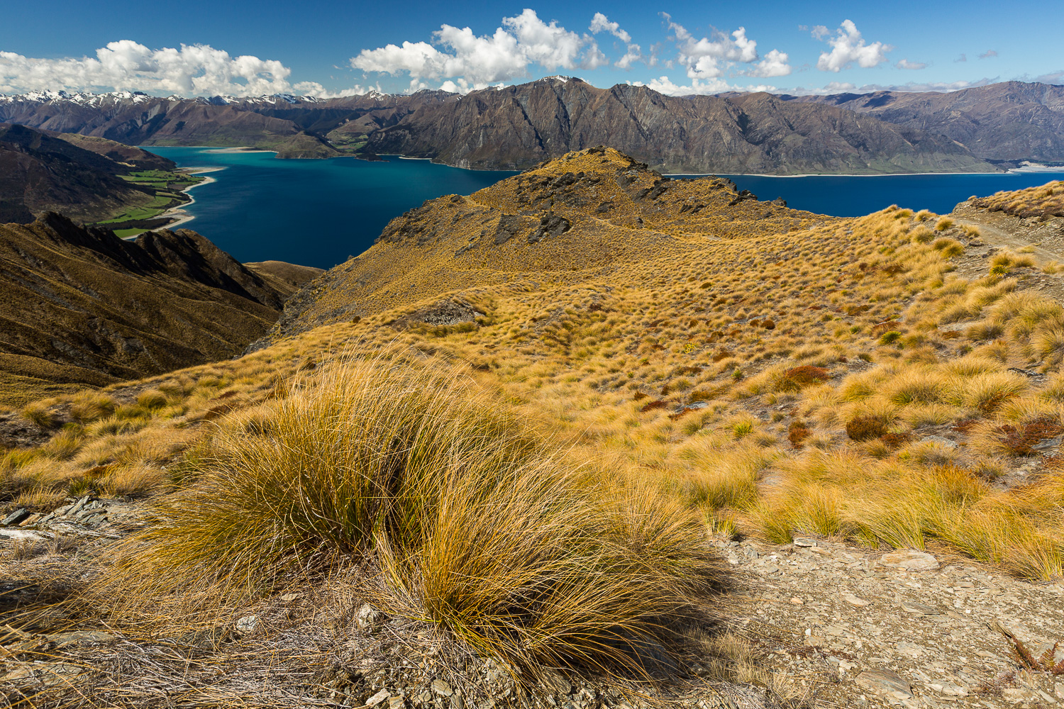 The landscape is vast, wild, and quintessentially Central Otago rolling golden slopes, snow-dusted peaks in the distance, and the clarity of the Southern Alps stretching far to the horizon. The track continues to climb until reaching the summit at 1,385 metres, where the reward is a sweeping panorama that rivals the famous Roys Peak but with fewer crowds and a stronger sense of solitude. From this vantage point, hikers can take in the grandeur of Mount Aspiring National Park, the braided valleys below, and the glistening lakes that make the region so iconic.