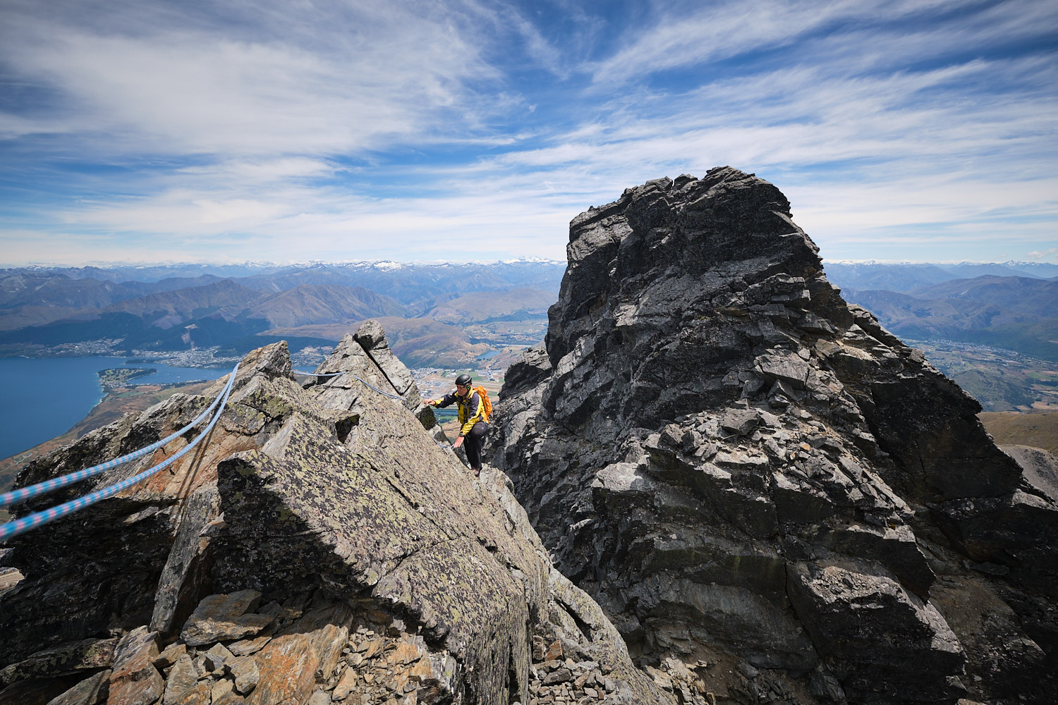 A couple of hours of climbing on the exposed ridge, with stunning views over Queenstown and Lake Wakatipu, you will reach the first summit of Double Cone.